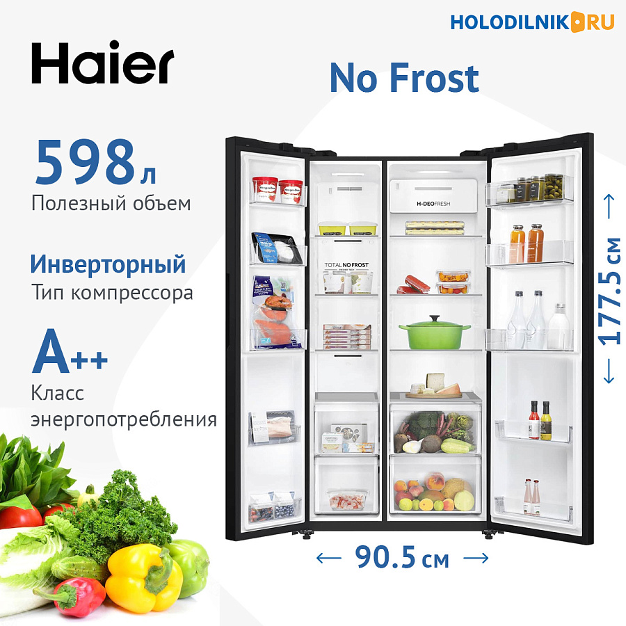 Купить современный холодильник Haier HRF-600DM7RU черного цвета с технологией No Frost и инверторным компрессором. Объем 598 л, класс энергоэффективности A++, LED-дисплей и подсветка. Система зона свежести, бесшумная работа. Гарантия, доставка по Москве и России. Специальное предложение на вместительный side-by-side холодильник Haier с экономичным энергопотреблением.