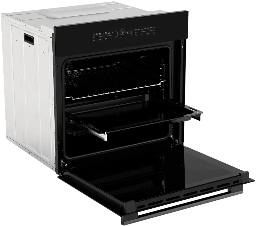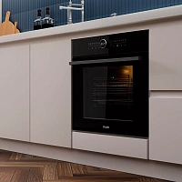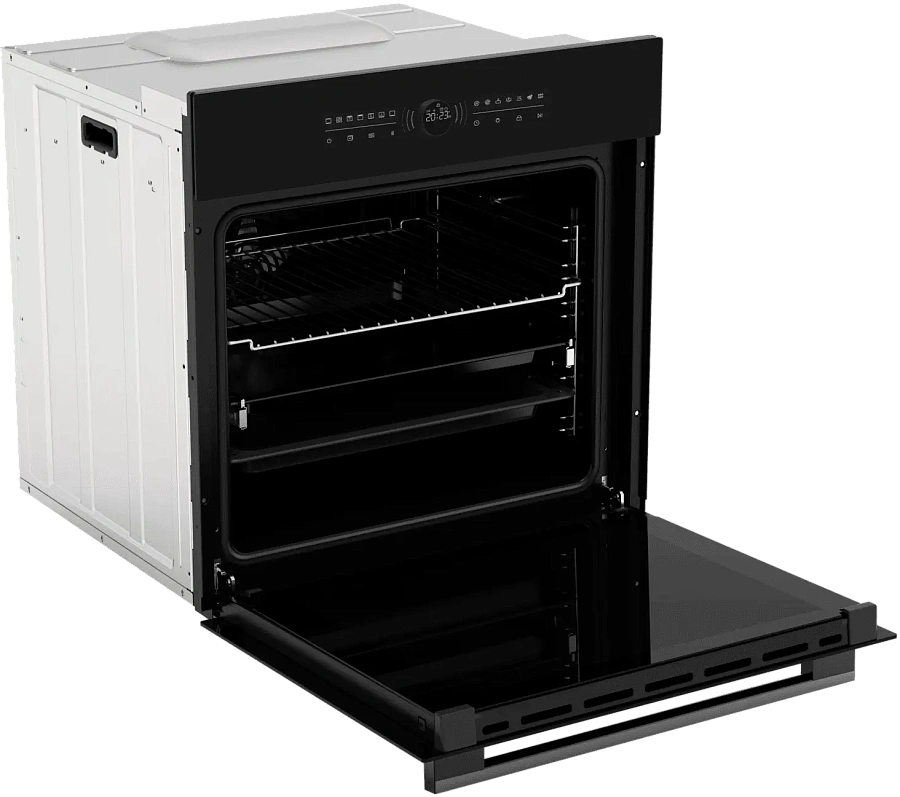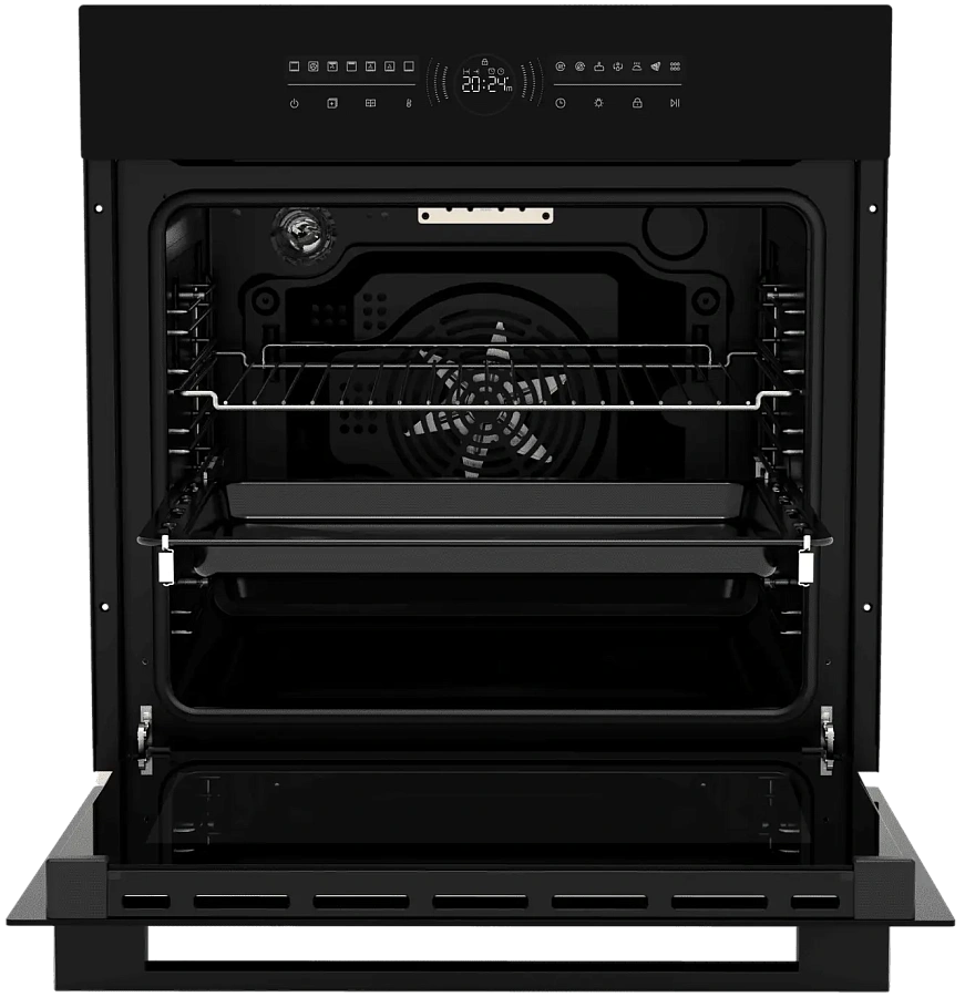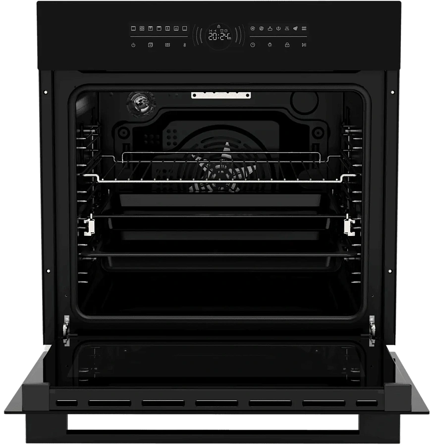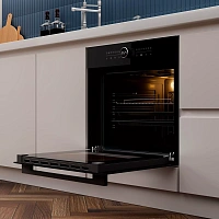 Духовой шкаф HOX-FT5AMTB имеет обновленную систему управления: сенсорная панель добавляет удобства в уходе, а центральный поворотный переключатель, помимо своего расширенного функционала, оснащен LED дисплеем с индикацией статуса работы и декоративной динамической индикацией. Максимальная температура нагрева составляет 310 градусов. Духовой шкаф оборудован выдвижными телескопическими направляющими, функцией аква очистки и тройным остеклением дверцы, что делает использование и невероятно комфортным, и безопасным.